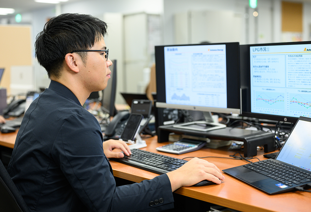 LPGを輸入船から一次基地に受け取り全国に届ける。その流れを安定させるのが私の仕事です。需要に比べて在庫が多すぎると保管場所であふれてしまうし、少なければ必要なときにガスが届きません。だからこそ在庫を過不足なく管理し、船の到着や需要の変化に合わせて調整を重ねます。常に動き続ける需給の中で、供給が途切れないようにバランスを整えることが求められています。